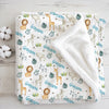 Bring the jungle to your nursery with this personalized baby blanket featuring lions, giraffes, elephants, hippos, and zebras surrounded by lush greenery leaves. Soft and cozy, it’s perfect for keeping your little adventurer warm during naps and playtime.