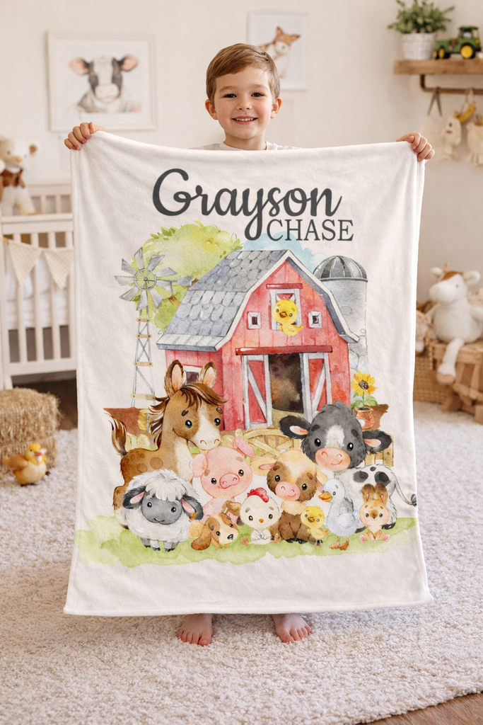 Snuggle up with barnyard buddies! This delightfully soft Personalized Farm Animals Baby Blanket features charming cows, horses, sheep, pigs, and chickens that'll have your little farmer giggling with joy. Add your child's name for that extra-special touch that transforms this cozy blanket into a treasured keepsake. Perfect for naptime adventures, tummy time fun, or as the standout gift at any baby shower!