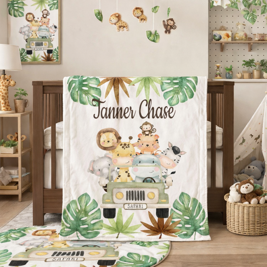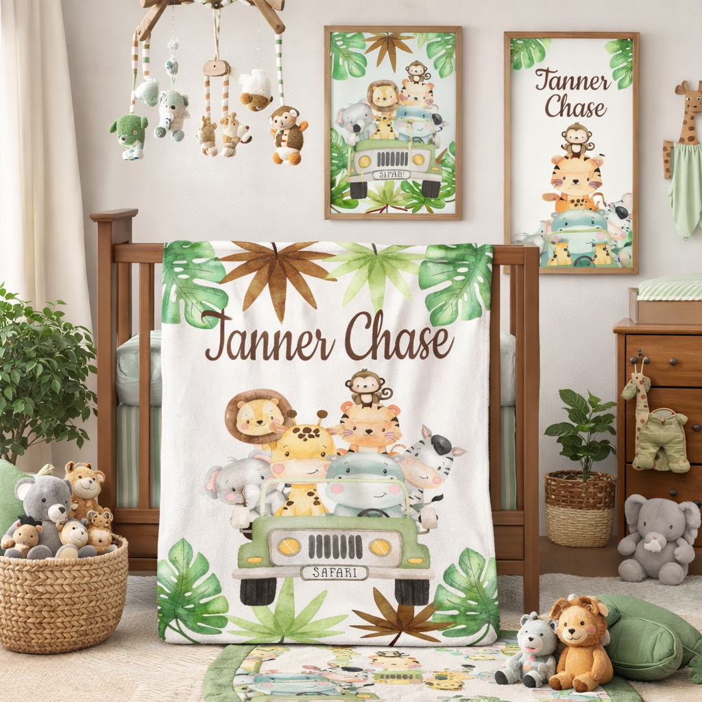 Wrap your little one in adventure with this Safari Animals Truck Baby Boy Name Blanket. Featuring playful safari animals and tropical leaves, this cozy blanket adds a fun, personalized touch to nap time or stroller rides. Soft and snug, it’s perfect for keeping your baby comfortable while sparking their imagination.