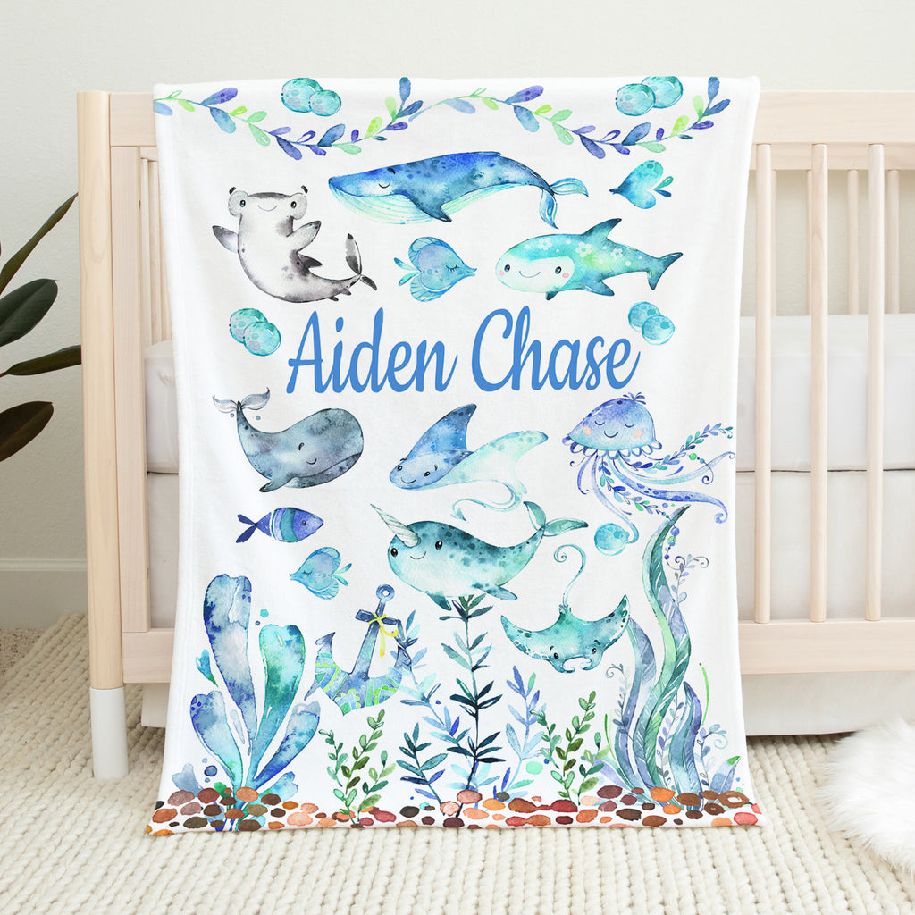 Dive into dreamland with our Sea Animals Baby Boy Name Blanket! This playful underwater adventure features charming watercolor whales, sharks, and jellyfish in soothing blue and green hues. Personalized with your little one's name, this cozy blanket makes the perfect ocean-themed baby shower gift while adding a splash of nautical charm to any nursery. Watch your tiny sailor drift off to sleep surrounded by friendly sea creatures!