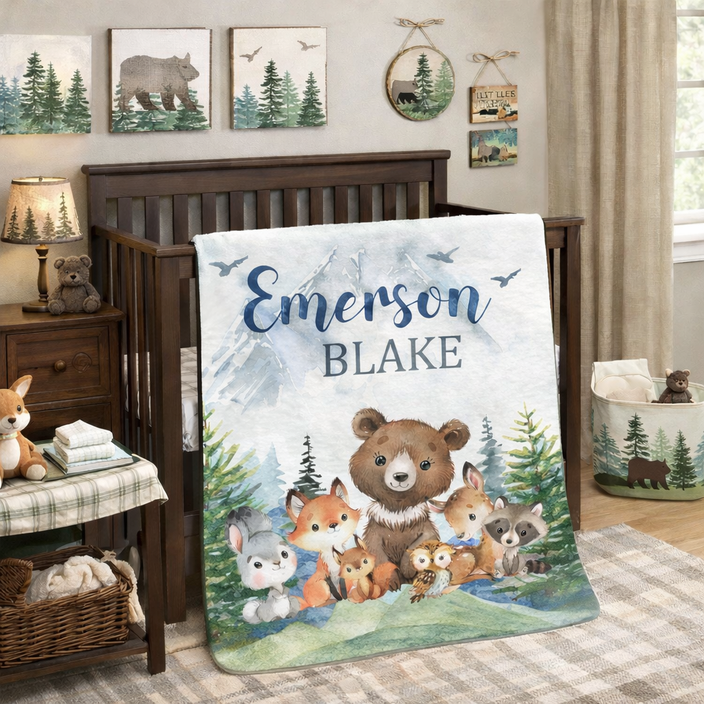Bring the beauty of the outdoors into your little one’s nursery with this cozy, custom woodland blanket. Featuring trees, mountains, and a playful mix of forest animals—including bears, foxes, raccoons, deer, bunnies, and owls.